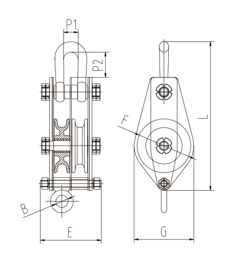 1、滑轮,采用精致铸钢轮,较之铸铁轮更加安全耐用。 2、合页,优质低碳合金钢锻造而成。并经过科学热处理,进而得到较高的综合强度和耐用度。 3、吊钩,经过精心设计,采用优质低碳